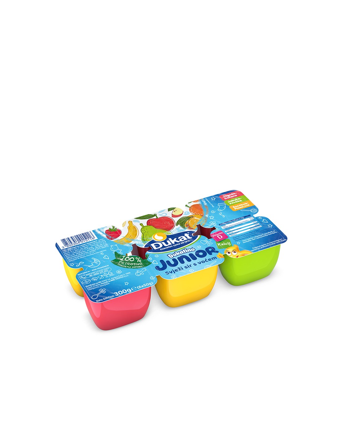 Dukatino svježi sir s voćem izvor je kalcija i vitamina D potrebnih za normalan rast i razvoj kostiju djece. Mali je, ali hranjivi obrok sa sastojcima prirodnog podrijetla koji objedinjuje sve vrijednosti svježeg sira i potpuno usitnjenog voća prilagođenog za najmlađe sladokusce. Dukatino svježi sir donosi tri omiljene voćne kombinacije okusa: jagode-banane, jabuke-kruške i breskve-marelice.