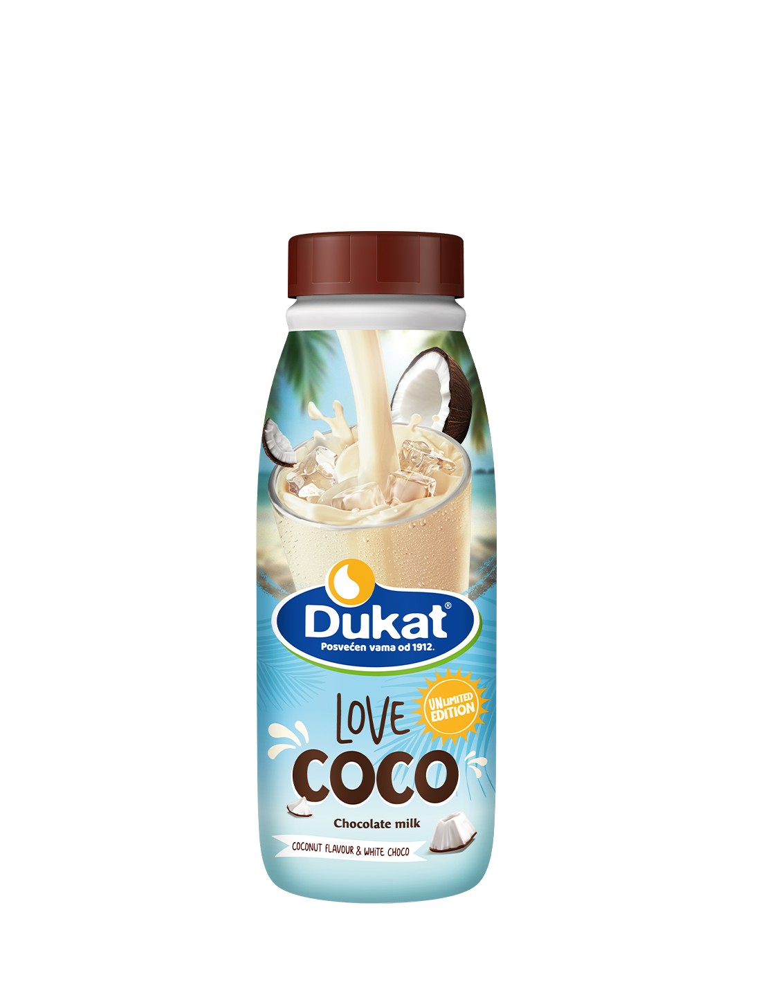 Dukat Love Coco čokoladno mlijeko spaja neodoljivu kombinaciju kokosa i bijele čokolade, pružajući savršeno kremast i osvježavajući doživljaj u svakom gutljaju.