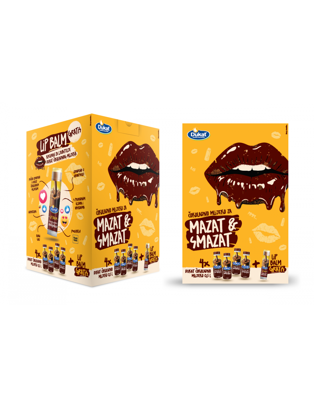 Mlijeko vrhunske kvalitete i najfiniji kakao savršena su kombinacija u Dukat čokoladnom mlijeku, čiji bogat okus i kremasta tekstura već godinama osvajaju potrošače svih uzrasta. U ovom neodoljivom pakiranju pronaći ćete 4 x Dukat čokoladno mlijeko 0,5 l i lip balm gratis! Balzam za usne s okusom Dukat čokoladnog mlijeka proizveden je u Hrvatskoj od prirodnih ulja i voskova, nježno hidratizira usne i daruje im blagi sjaj.
