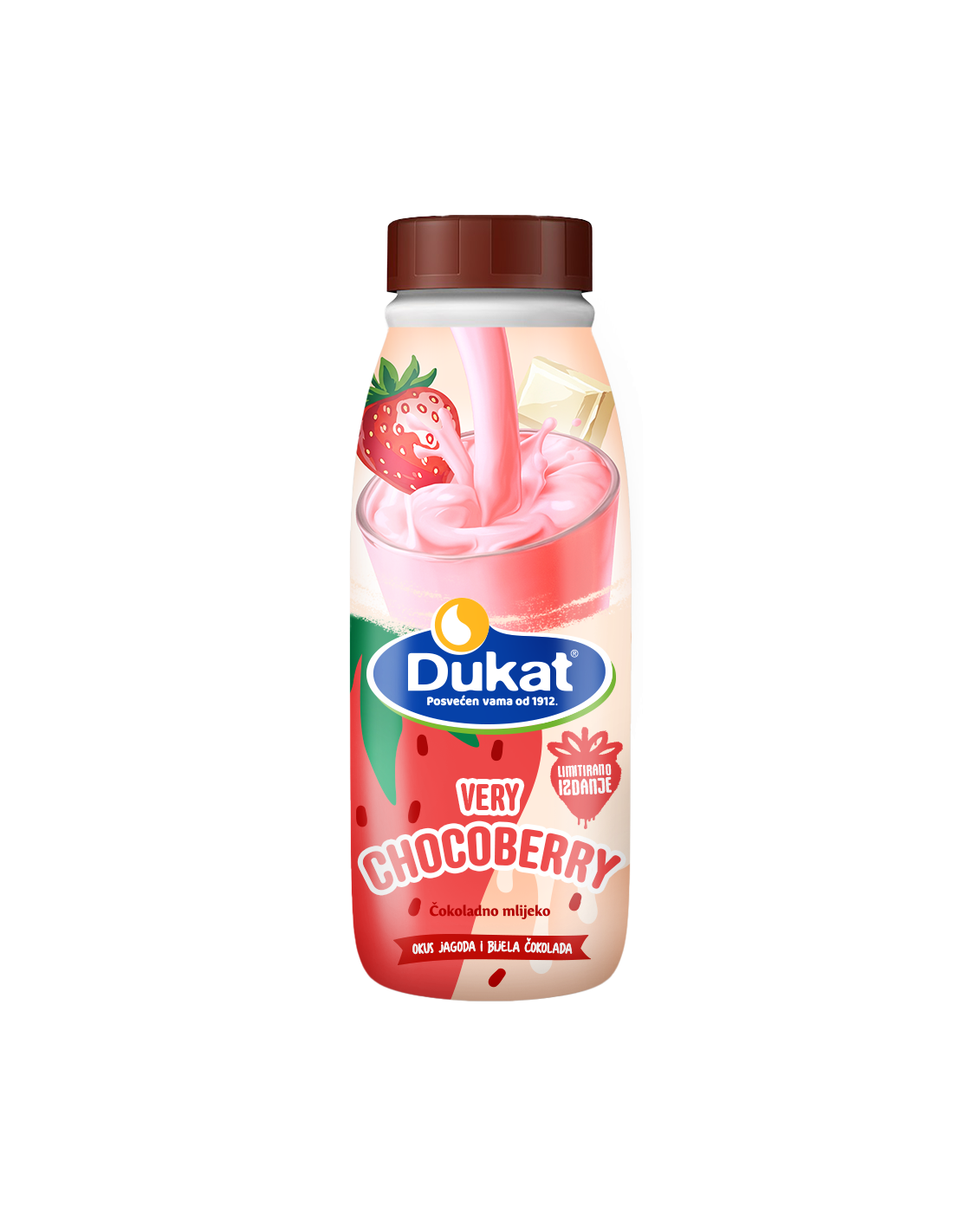 Limitirano izdanje Dukat čokoladnog mlijeka – Very Chocoberry – spaja neodoljivu kombinaciju jagode i bijele čokolade, pružajući savršeno kremast i osvježavajući doživljaj u svakom gutljaju. Dolazi u praktičnoj 0,5L boci, idealnoj za uživanje bilo kad i bilo gdje. Isprobajte Very Chocoberry i prepustite se ovom jedinstvenom užitku!